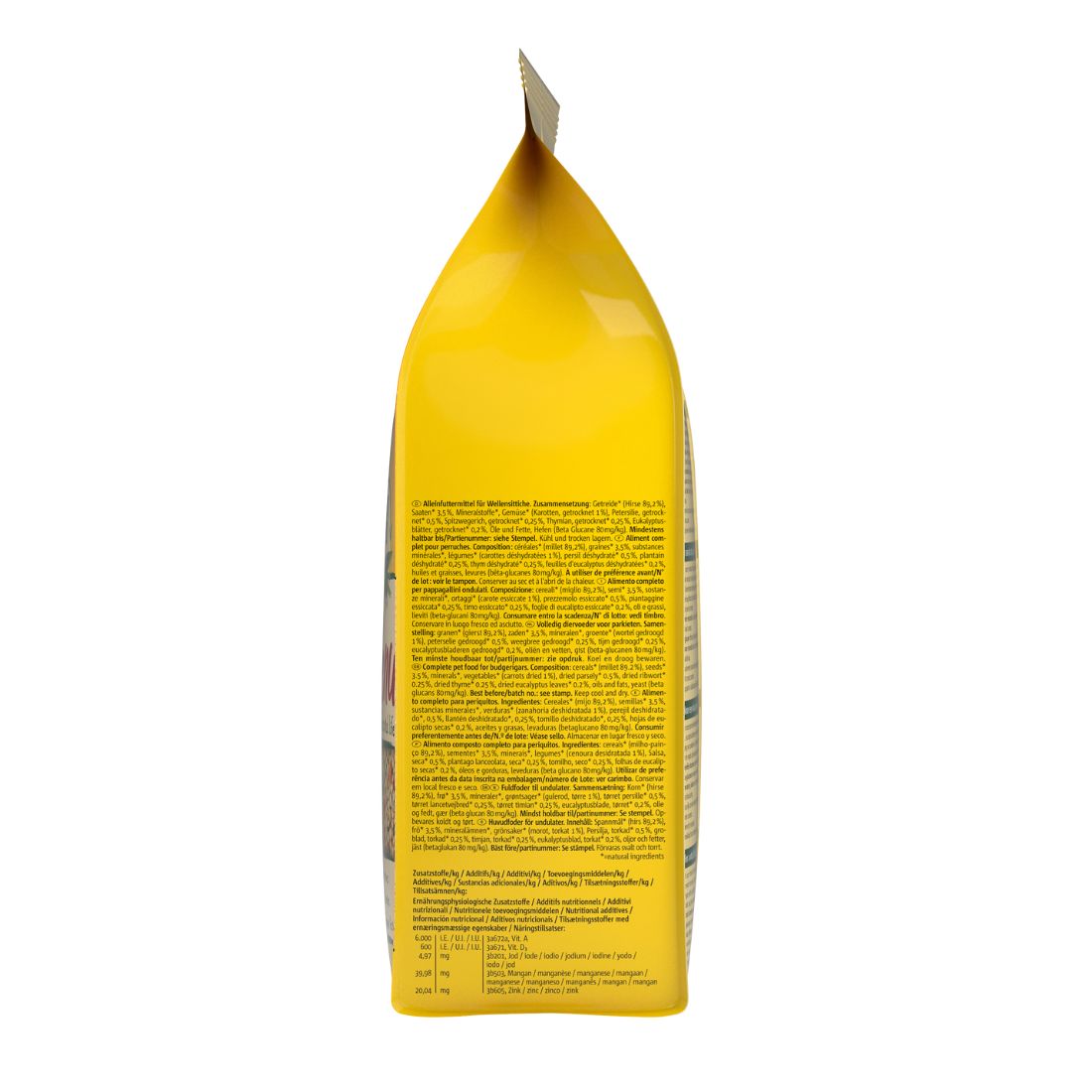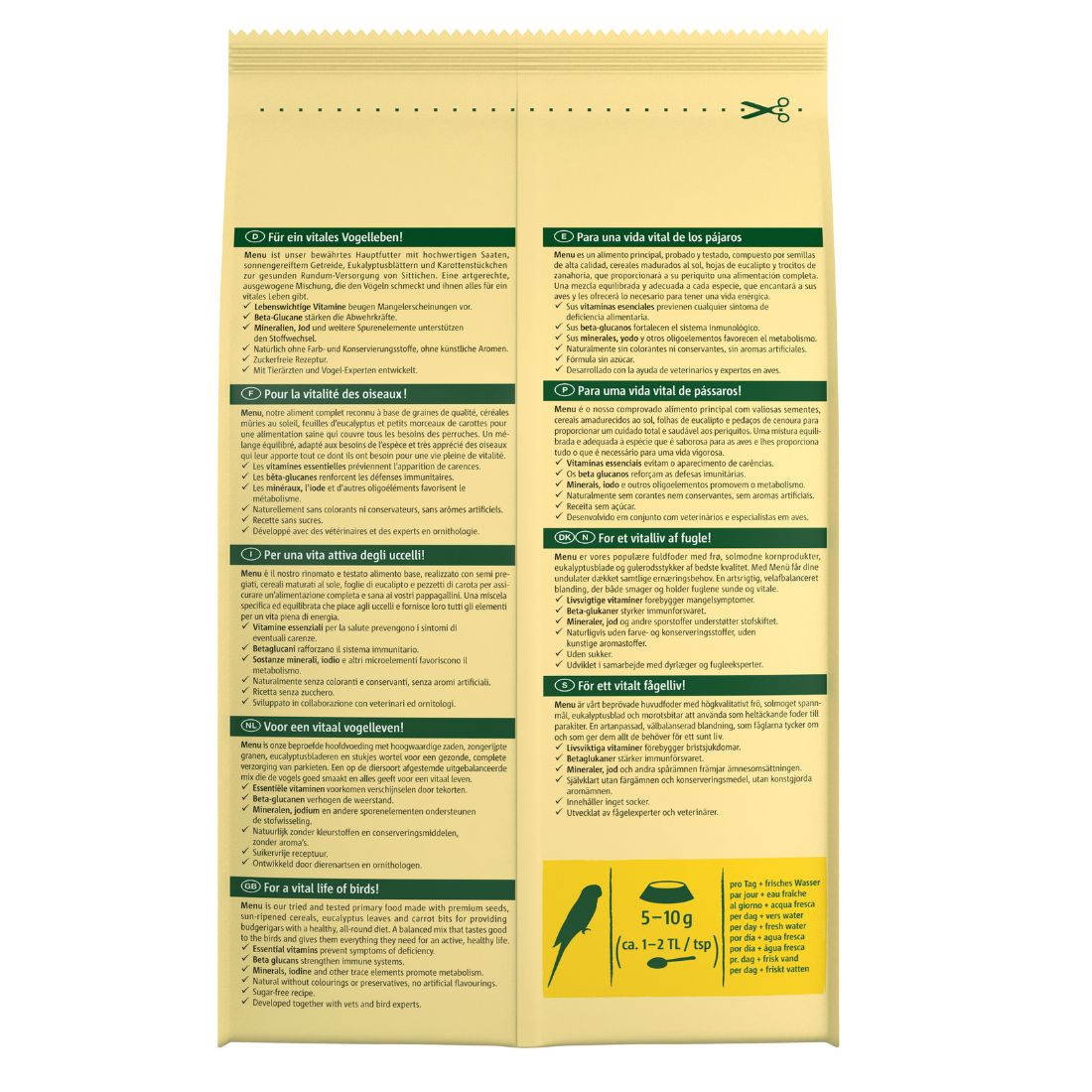 Embalagem: Packs de 5 unidades de Menus de 1 kg — ideal para manter os seus periquitos felizes e ativos.