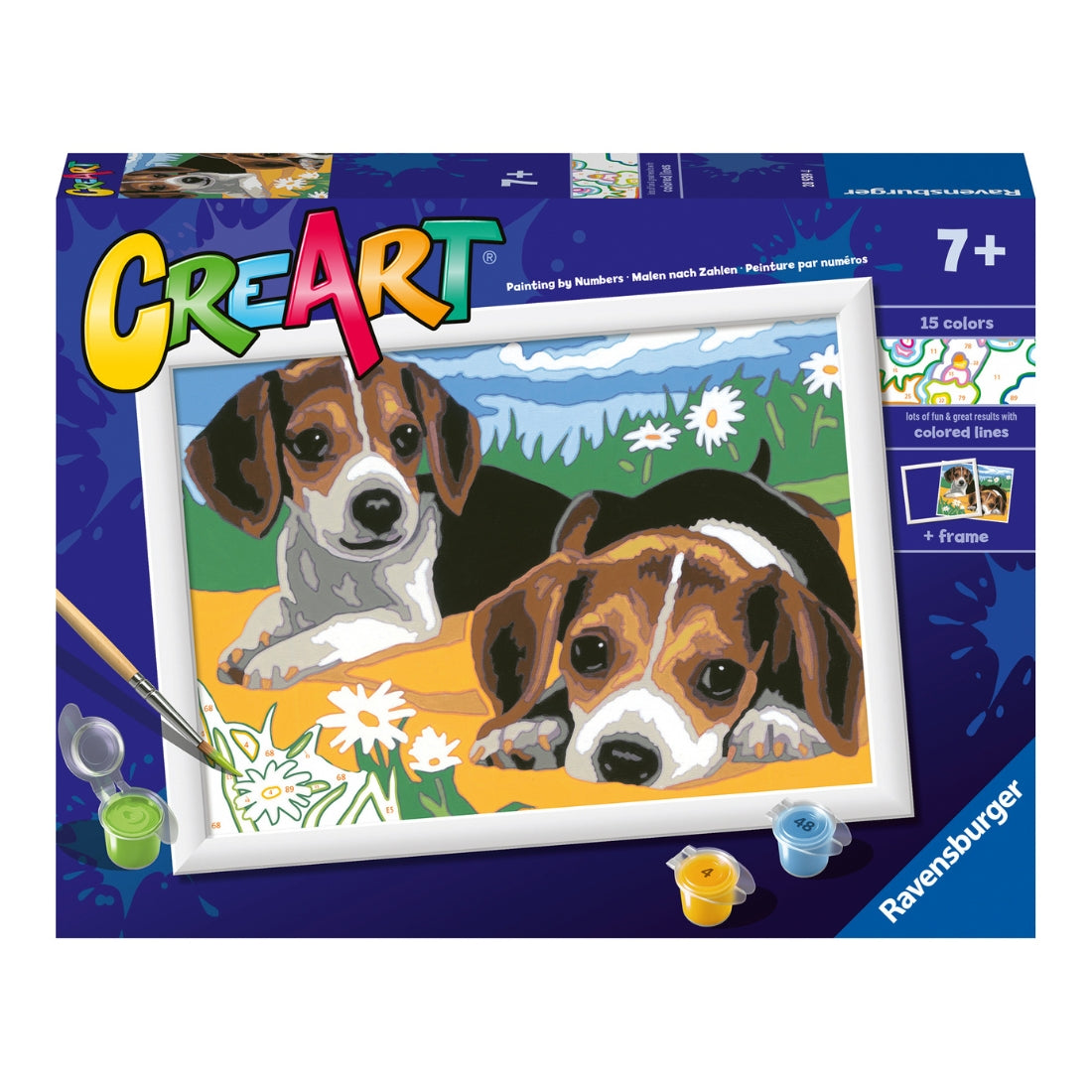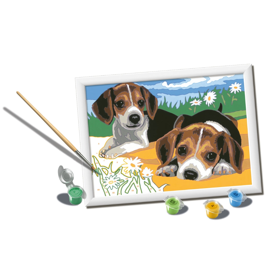 Estes dois cãezinhos Jack Russell são pura energia e ternura! Com o kit CreArt da Ravensburger, Série D, os pequenos artistas podem dar vida a esta cena encantadora com pinceladas de cor e dedicação.