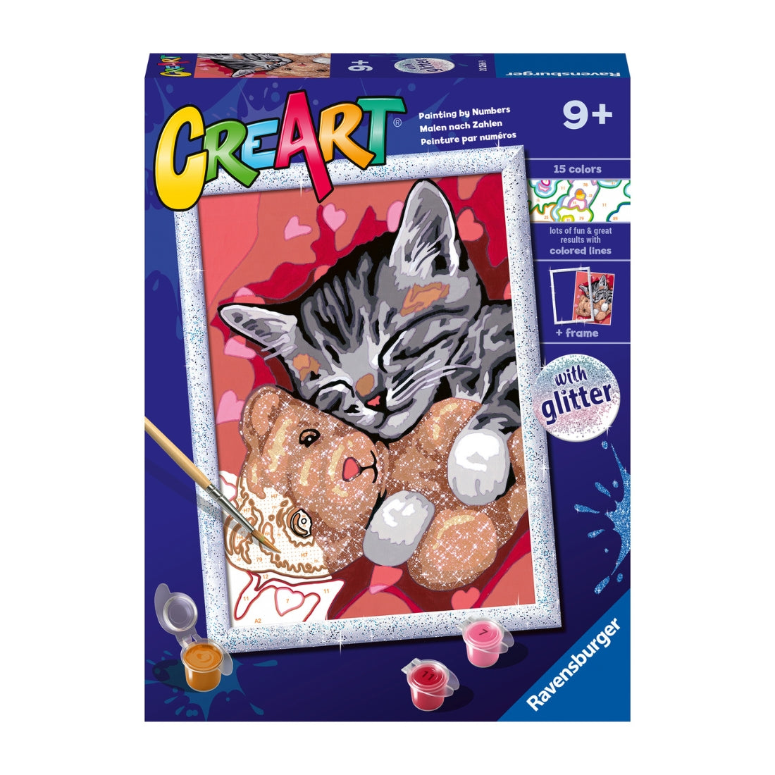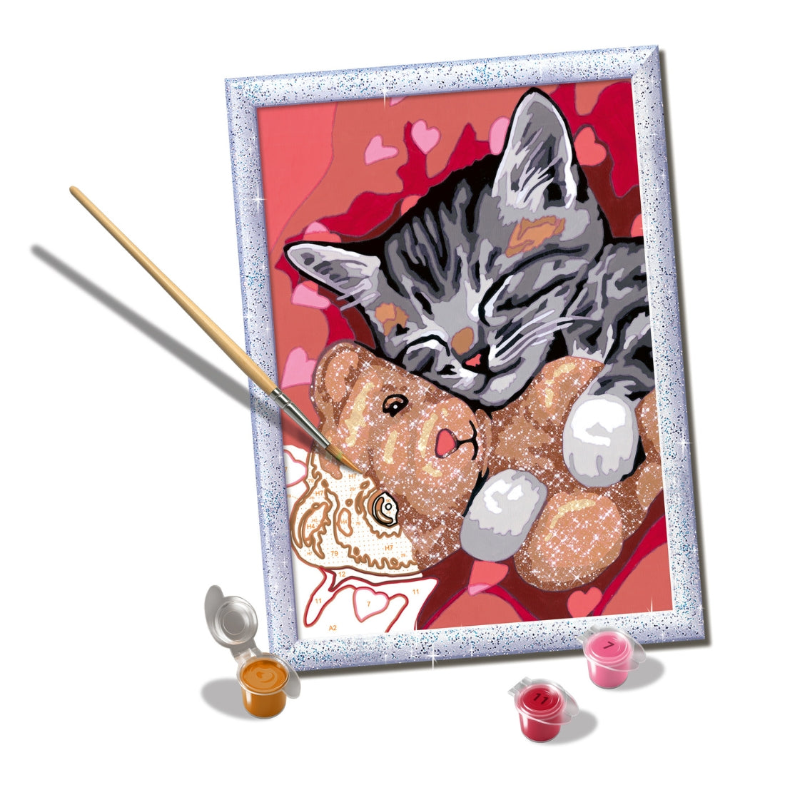 Ternura a dobrar! Este kit CreArt da Ravensburger da Série D Classic traz um adorável gatinho abraçado ao seu inseparável ursinho de peluche, uma cena doce que vai derreter corações.